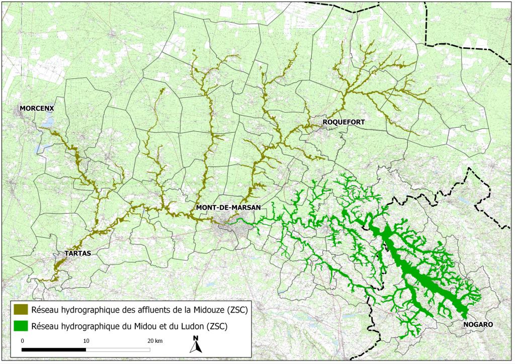 * Site de la Midouze : Arengosse, Arjuzanx, Arue, Audon, Bégaar, Bélis, Bourriot-Bergonce, Brocas, Cachen, Campagne, Campet-et-Lamolère, Canenx-et-Réault, Carcarès-Sainte-Croix, Carcen-Ponson, Cère, Estigarde, Garein, Geloux, Labrit, Le-Sen, Lencouacq, Losse, Lucbardez-et-Bargues, Maillères, Meilhan, Mont-de-Marsan, Ousse-Suzan, Pouydesseaux, Retjons, Roquefort, Saint-Avit, Saint-Gor, Saint-Martin-d'Oney, Saint-Perdon, Saint-Pierre-du-Mont, Saint-Yaguen, Tartas, Uchacq-et-Parentis, Vert, Vielle-Soubiran, Villenave et Ygos-Saint-Saturnin. Site du Midou-Ludon : Artassenx, Arthez-d’Armagnac, Bougue, Bourdalat, Castandet, La Frêche, Gaillères, Hontanx, Labastide-d’Armagnac, Lacquy, Laglorieuse, Maurrin, Mazerolles, Mont-de-Marsan, Montégut, Perquie, Pouydesseaux, Pujo-le-Plan, Saint-Cricq-Villeneuve, Sainte-Foy, Saint-Gein, Saint-Justin et Villeneuve-de-Marsan pour les Landes et Bourrouillan, Castex-d'Armagnac, Caupenne-d'Armagnac, Estang, Le Houga, Lannemaignan, Laujuzan, Lias-d'Armangnac, Luppé-Violles, Magnan, Mauléon-d'Armagnac, Maupas, Monguilhem, Monlezun-d'Armagnac, Mormès, Nogaro, Panjas, Perchède, Sainte-Christie-d'Armagnac, Salles-d'Armagnac et Toujouse pour le Gers.