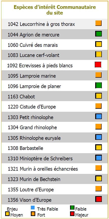 Vison d’Europe, Loutre, 7 espèces de chauves-souris dont le Grand Rhinolophe et le Murin à oreilles échancrées, Cistude, Lamproie marine et de planer, Ecrevisse à pattes blanches, Leucorrhine à gros thorax, Agrion de mercure, Fadet des Laîches, Faux cresson de thore, Flûteau nageant…