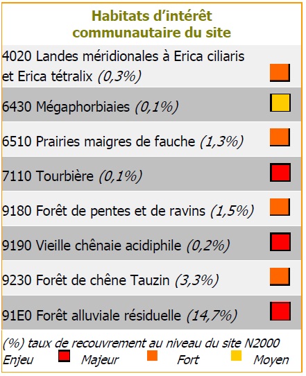 Aulnaie-Frênaie, Vielle chênaie acidiphile, Forêt de chênes tauzin, Forêt de pentes et de ravins, Lande tourbeuse à bruyère ciliée et bruyère à quatre angles, Tourbière active à Narthécie, Landes à molinie bleue…