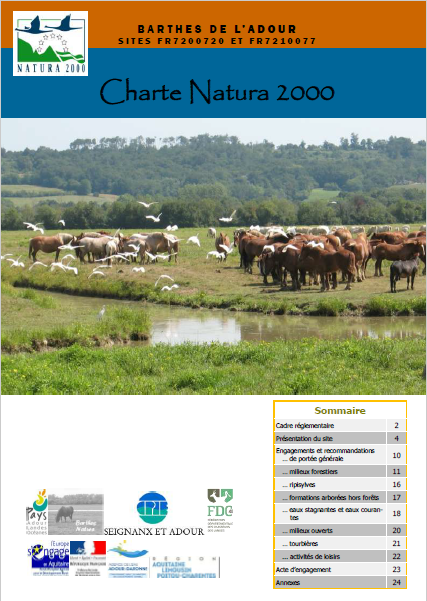 La charte Natura 2000 des Barthes de l’Adour recense les bonnes pratiques de gestion existantes ou à privilégier dans les barthes au regard des enjeux de conservation de leur richesse biologique.La Charte présente des engagements et recommandations de gestion d’ordre général, puis est déclinée par grands types de milieux naturels (milieu forestier, eaux stagnantes et courantes, ripisylves…).