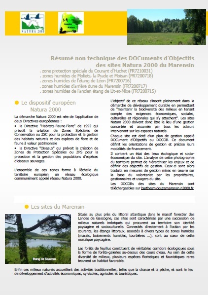 Les DOCOBs du Marensin ont été validés en décembre 2012 et 2014 (pour celui de l'ancien étang de Lit-et-Mixe).